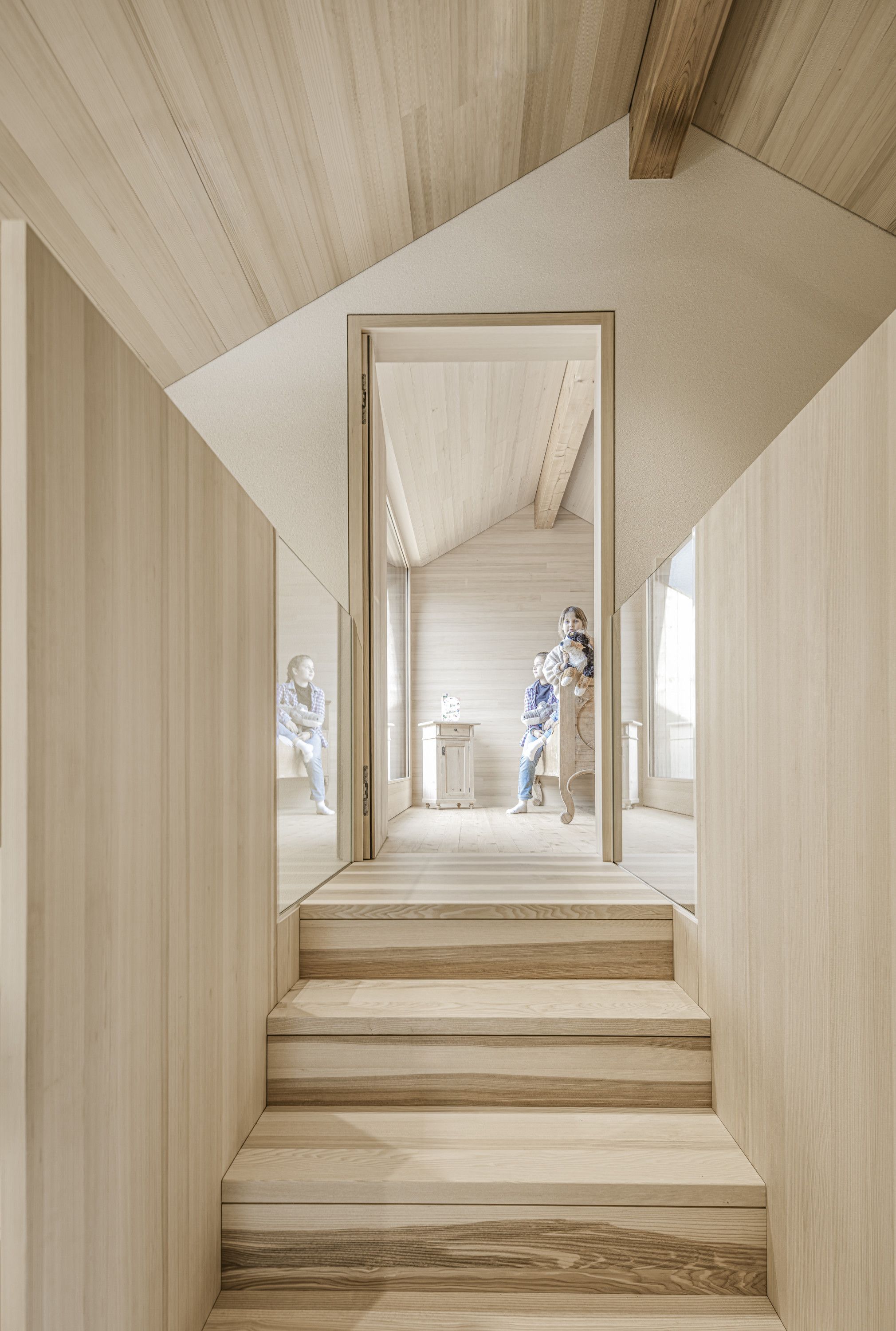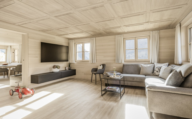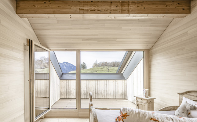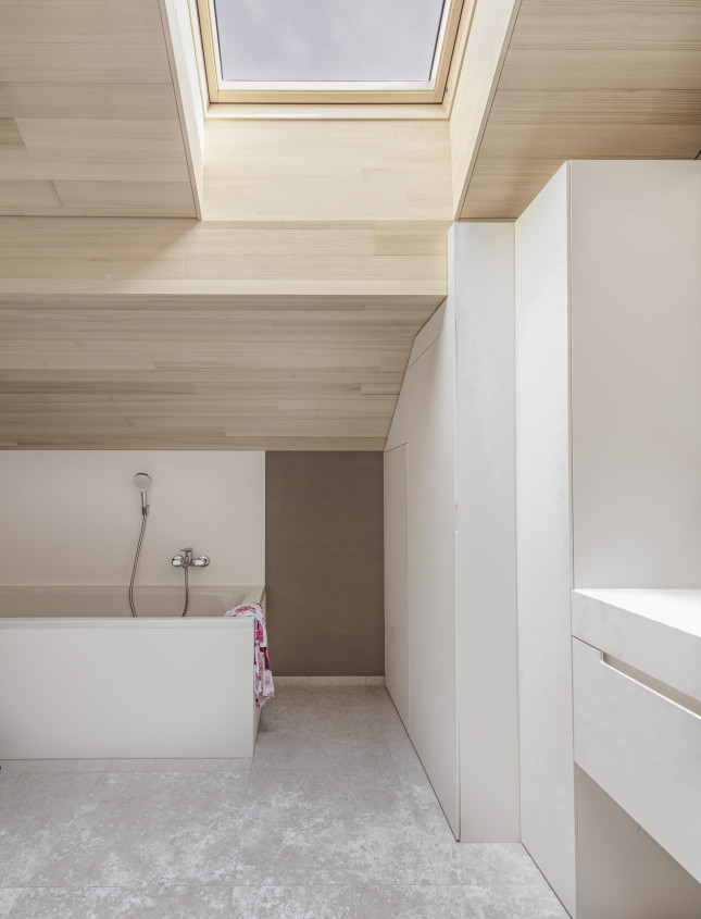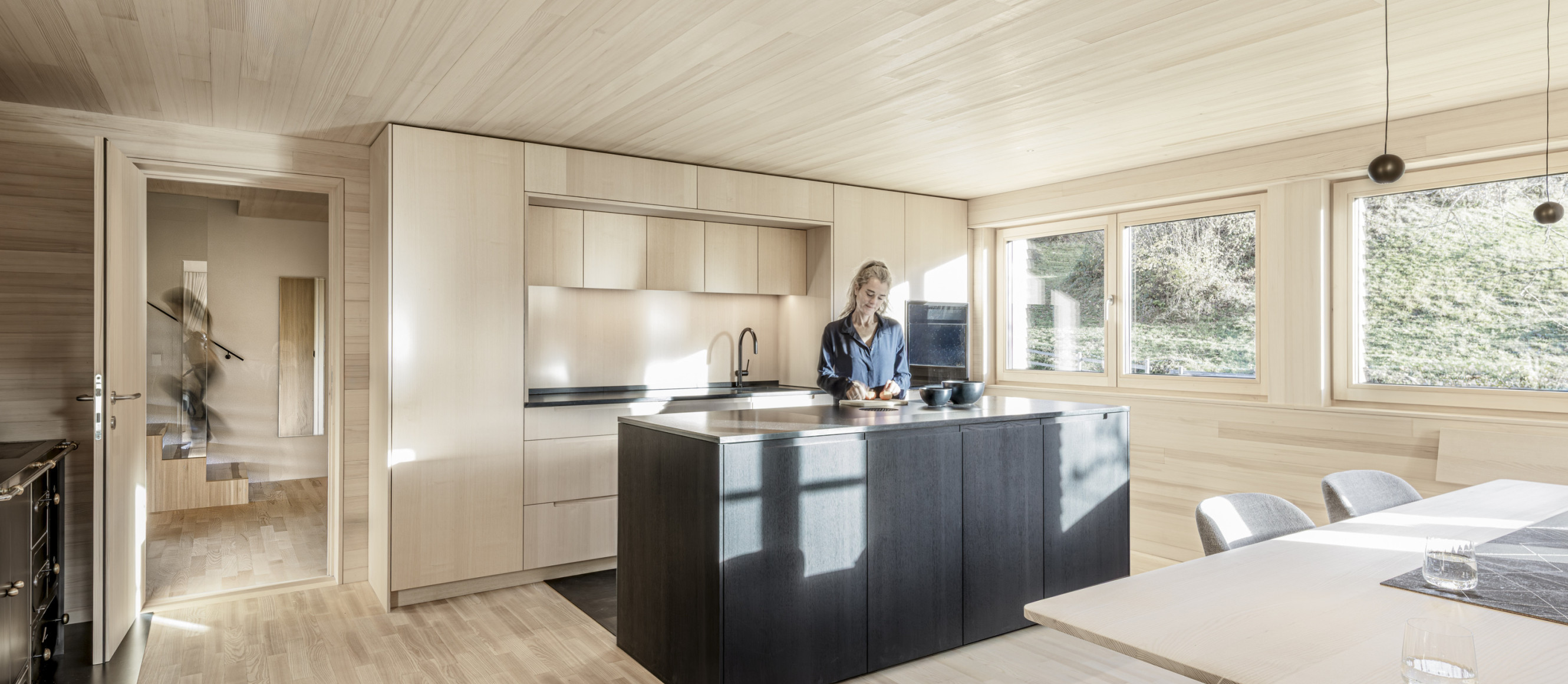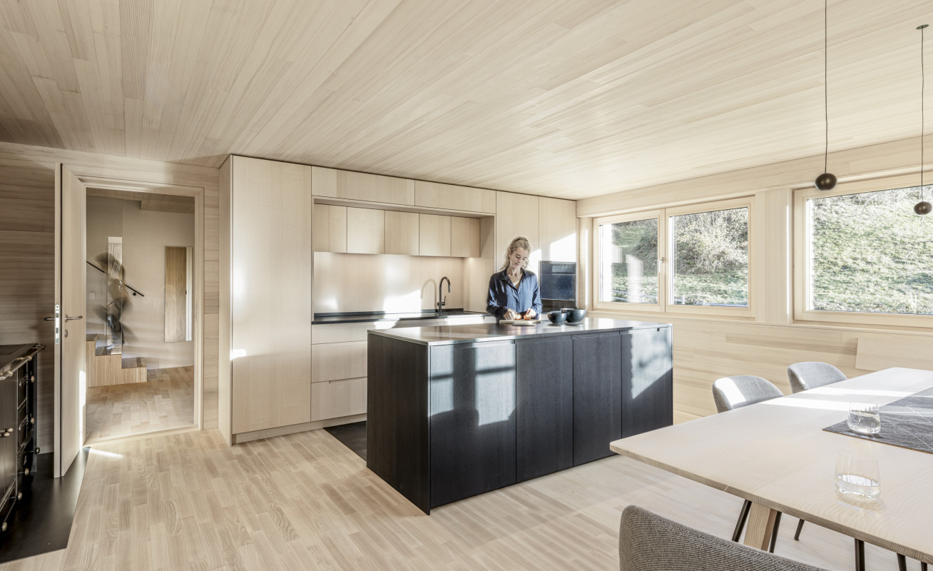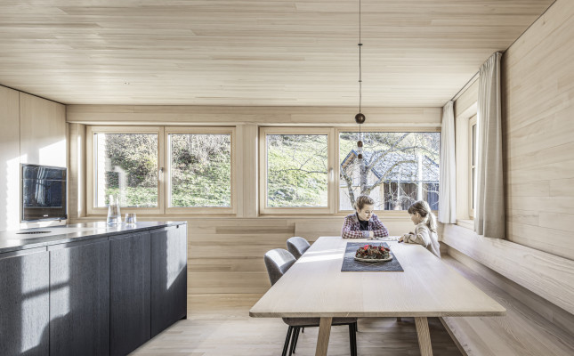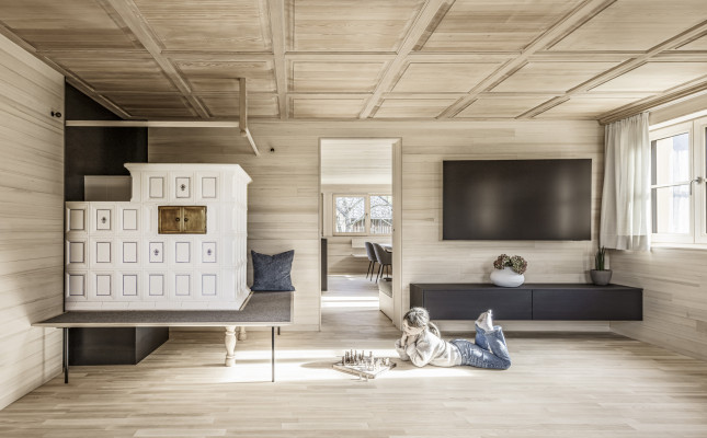 Es wurde weitergeführt, was vorhanden war. So wurden beispielsweise die Böden geschliffen und geölt und die Kassettendecke der Stube sandgestrahlt und erhalten. Die Küche wurde vergrößert und der bestehende Holzherd, der täglich in Gebrauch ist, mit Schwarzstahl neu gefasst. Das Dachgeschoss erhält Licht über einen begehbaren Dacheinschnitt statt über eine undichte Verglasung.