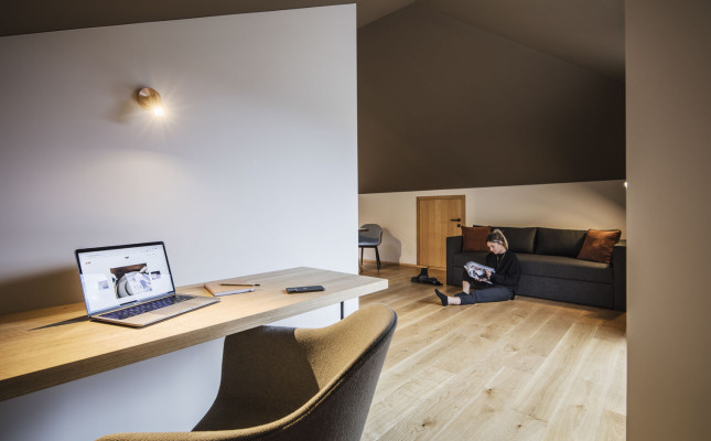 Die Innenräume öffnen sich mit ihren groß angelegten Fensterflächen zum Balkon und zur Naturlandschaft. Die Zeitlosigkeit die das Interior mit sich bringt, bildet eine klare Art von Elementen die sich überall im Gebäude aufspüren lassen.