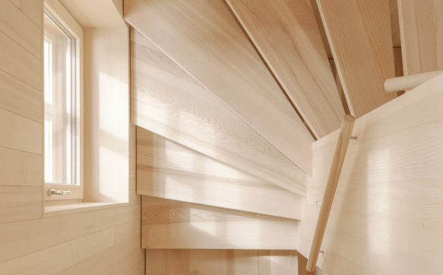 Die Außenhülle des Hauses ist mit Holzschindeln verkleidet, einer Technik, die nicht nur ästhetische Gründe verfolgt, sondern auch der Witterungsbeständigkeit dient. Im Laufe der Jahre entwickelt das Holz eine silbergraue Patina, die das Gebäude zusätzlich in die natürliche Umgebung integriert und den authentischen Charakter verstärkt.