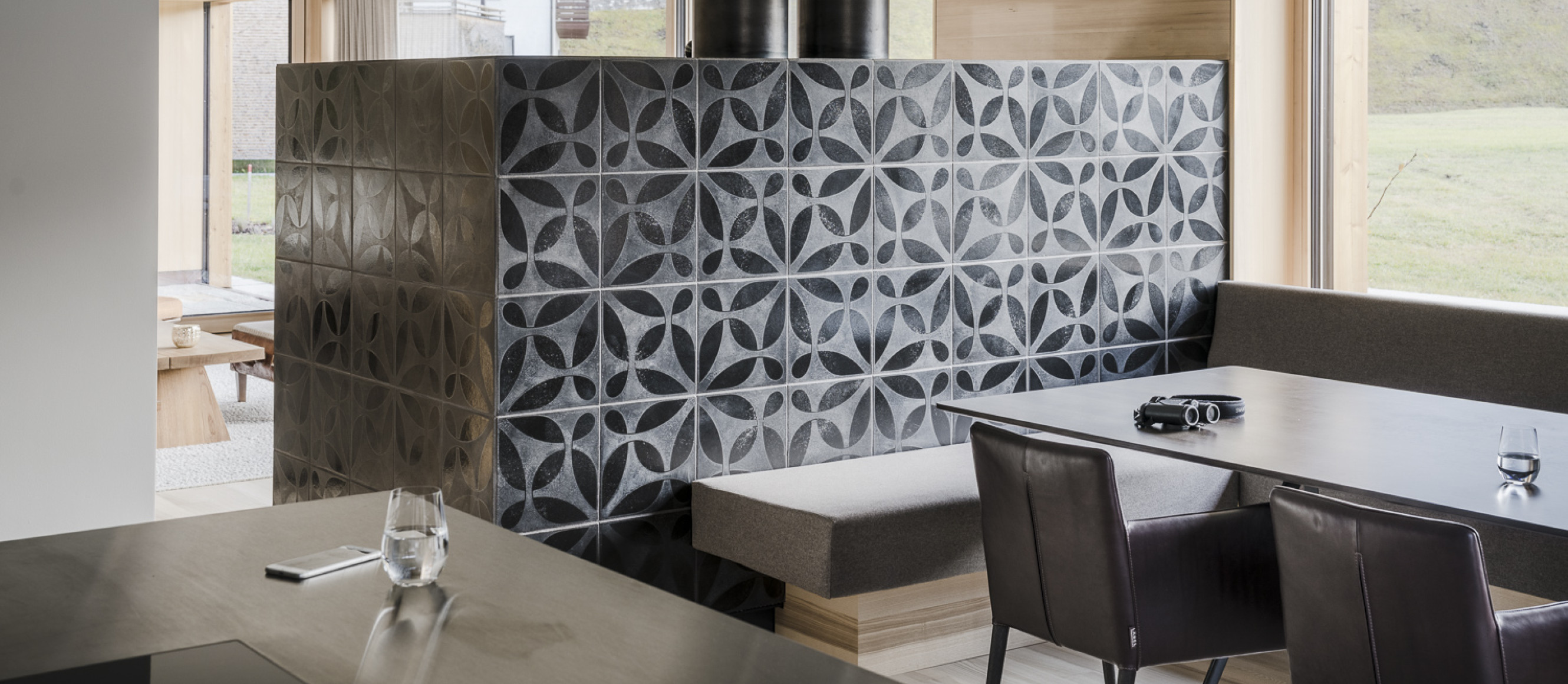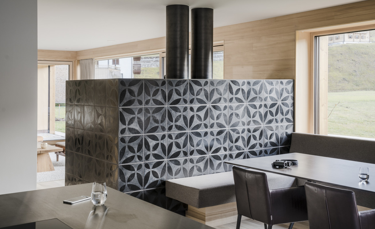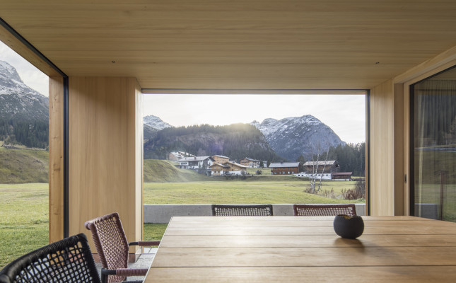 Die Innenräume sind als offene Grundrisse organisiert und haben große Öffnungen zum Bergpanorama. Der Raum verbindet den Bewohner mit seiner Umgebung. Durch die Innenauskleidung mit schlichtem Weisstannentäfer wirken die Räume weich und vermitteln ein Gefühl von Geborgenheit.