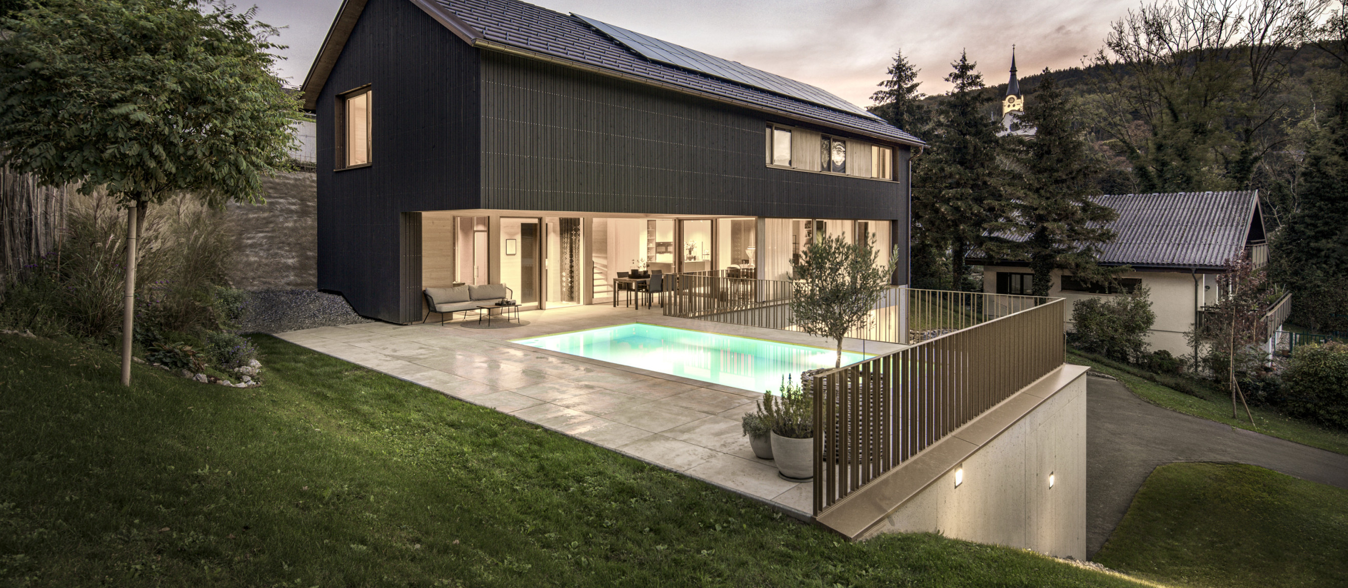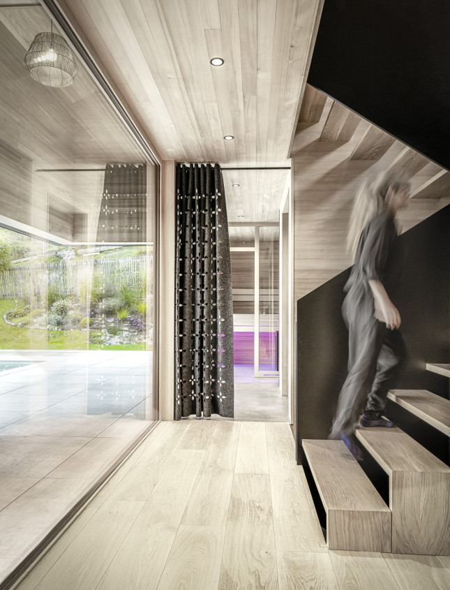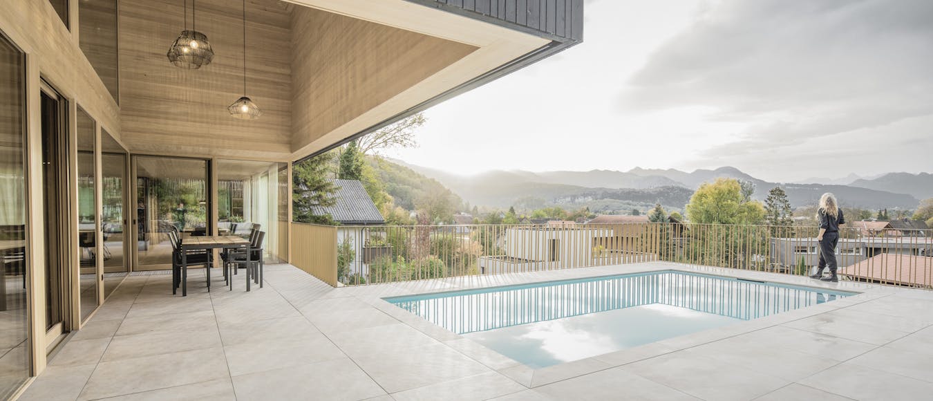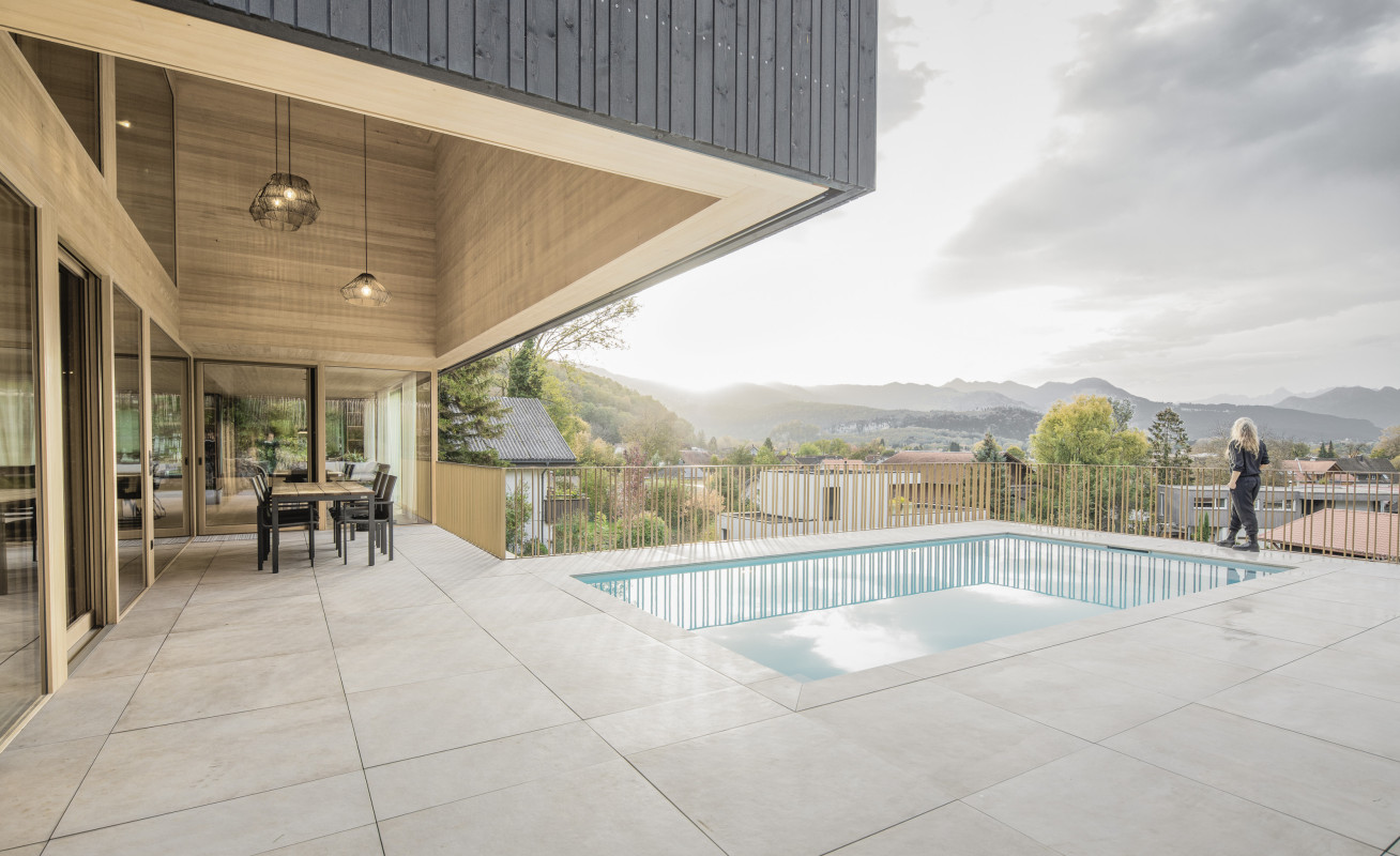 Ein Highlight ist der Outdoor-Bereich mit Pool und Sauna. Während der Pool an warmen Tagen für Erfrischung sorgt, lädt die Sauna zum Entspannen ein. Haus B & B ist ein Ort zum Ankommen, Durchatmen und Genießen. Es vereint moderne Wohnqualität mit der Kraft der Natur und schafft ein Zuhause, das Eleganz, Komfort und Achtsamkeit auf einzigartige Weise miteinander verbindet. Ein Lebensraum, der sich nicht nur an die Landschaft anpasst, sondern mit ihr verschmilzt.