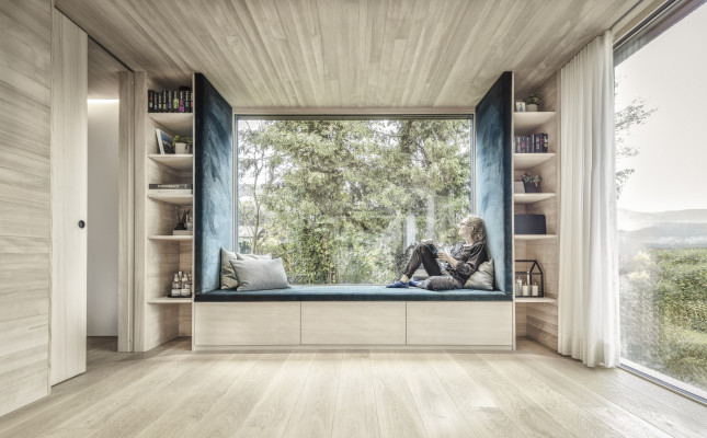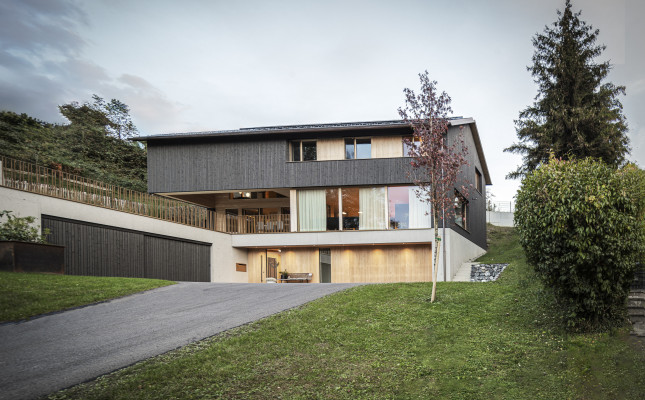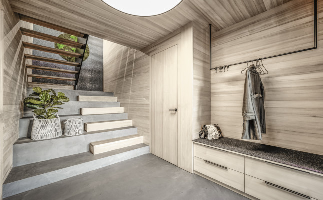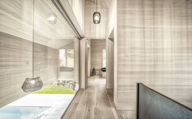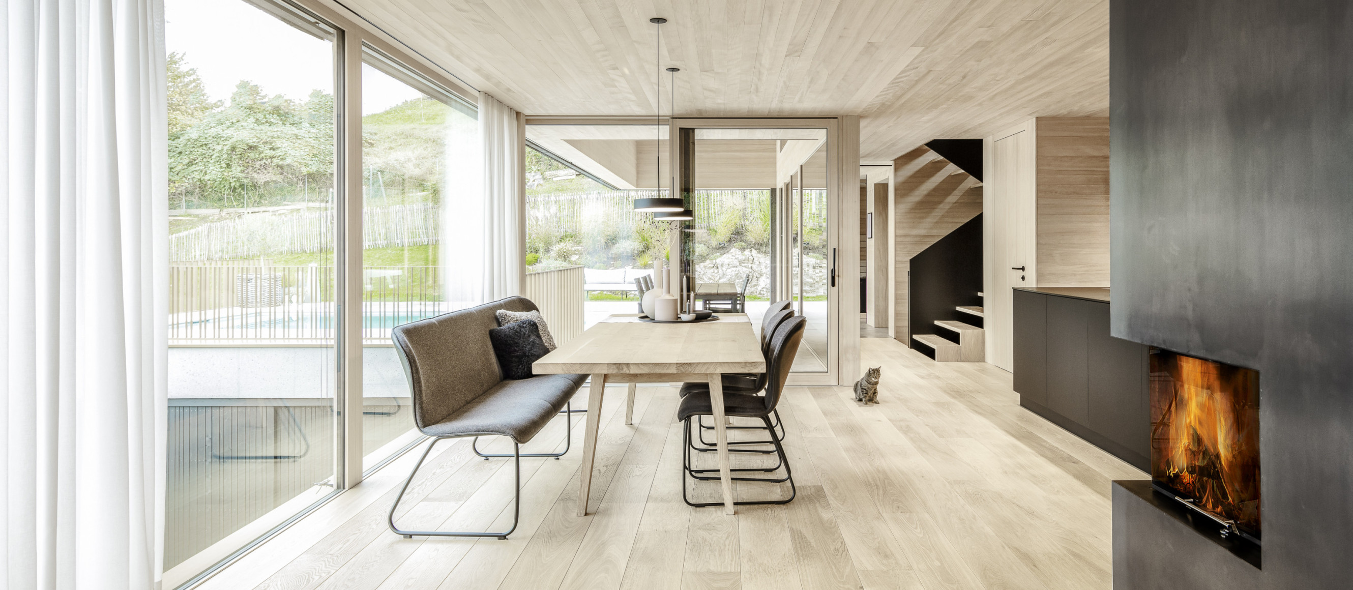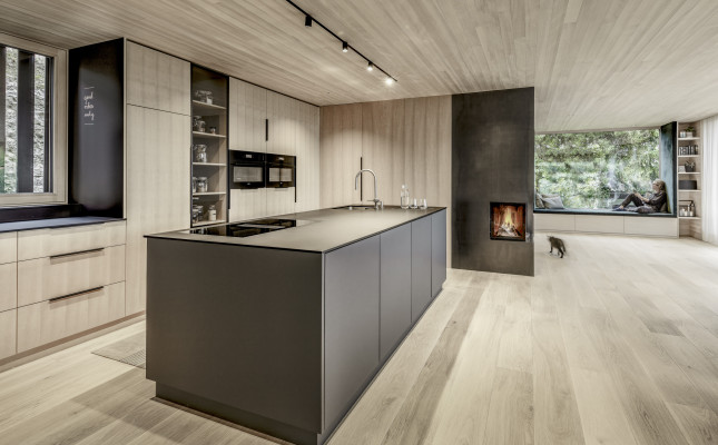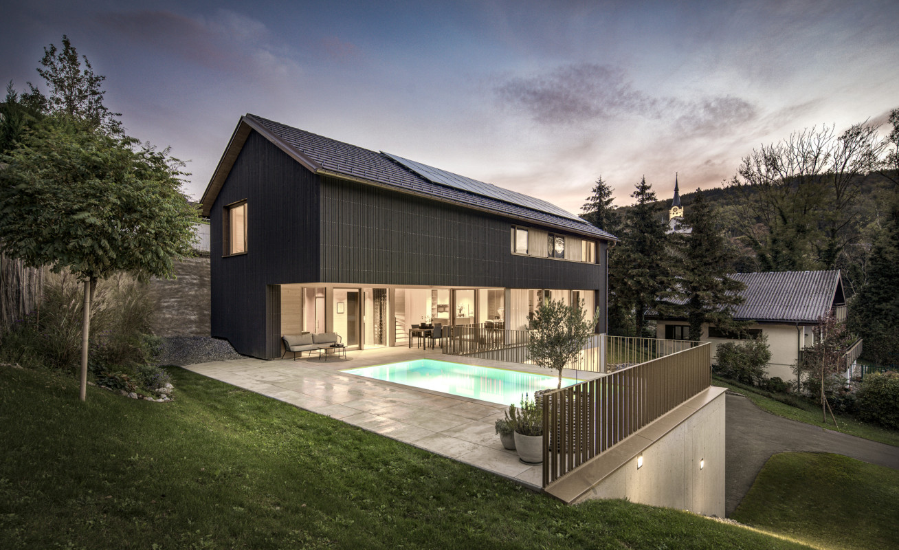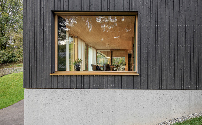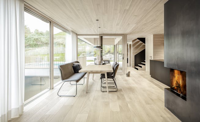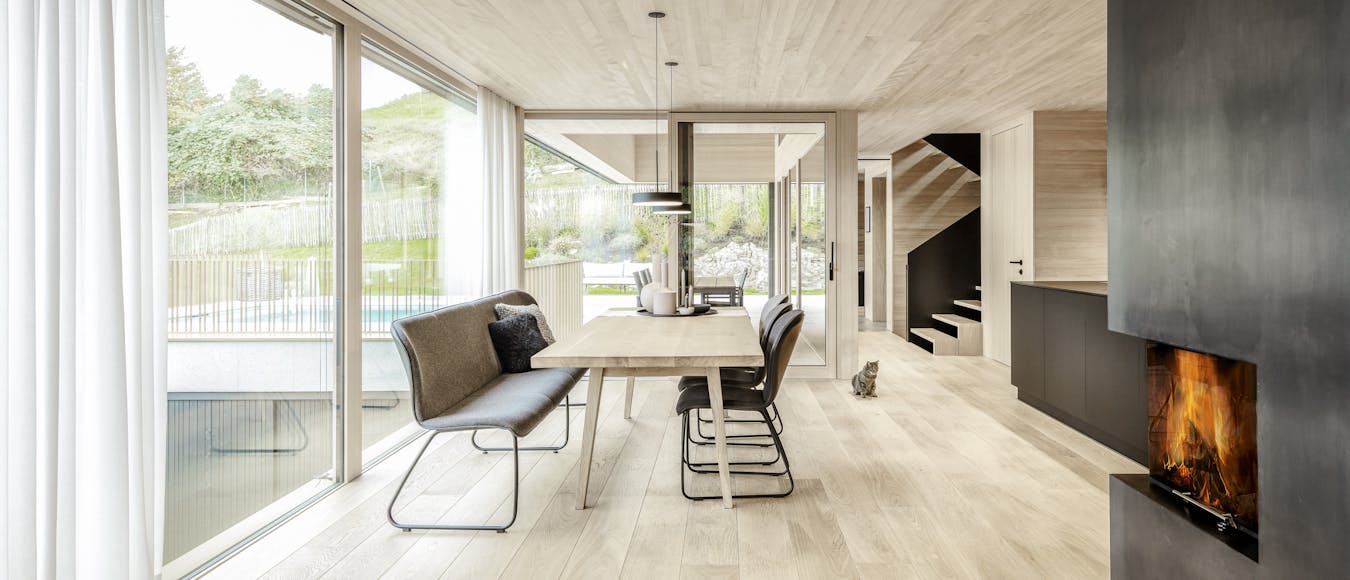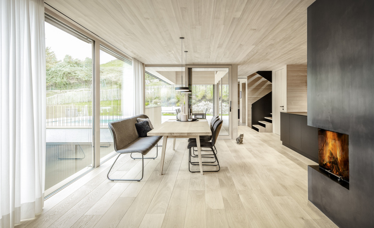 Große Verglasungen holen die Landschaft ins Innere und schaffen eine einzigartige Verbindung zwischen drinnen und draußen. Die Materialwahl unterstreicht den Charakter des Hauses: Beton verleiht der Architektur Stabilität und Struktur, während Holz eine warme, natürliche Wohnatmosphäre schafft. Die vertikale Fichtenholzfassade integriert das Gebäude sanft in die Umgebung, während im Innenraum Eiche und Weißtanne für ein behagliches Ambiente sorgen. Naturofloor-Beschichtungen in den Bädern setzen elegante Akzente und vervollständigen das stimmige Gesamtbild.