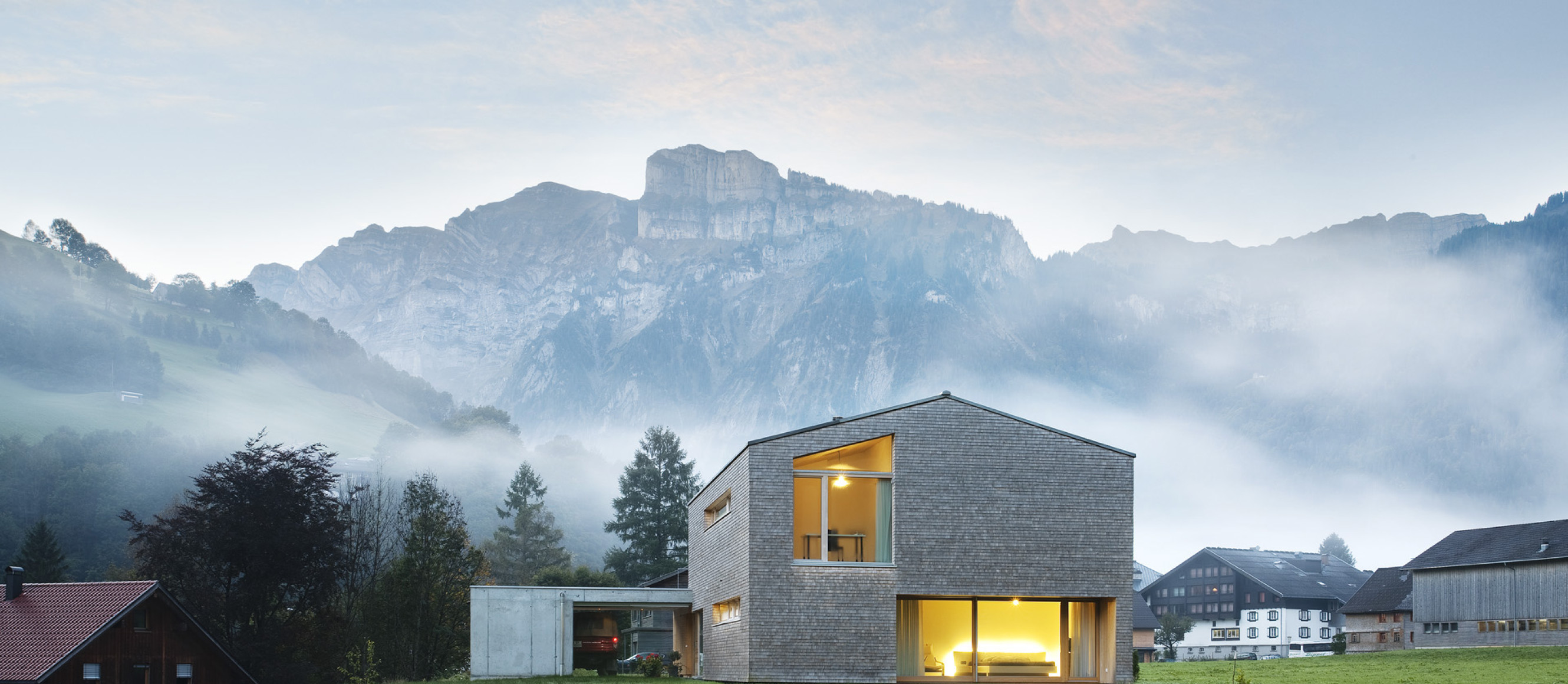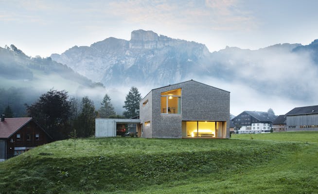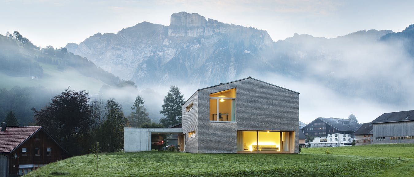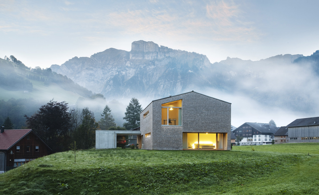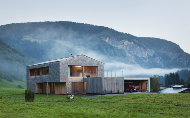Bei der Planung wurde an die lokale Tradition angeknüpft. Das Einfamilienhaus in Holzriegelbauweise ist mit einer Weißtannenschindelfassade versehen, die über die Jahre verwittert und immer schöner wird. Trotz seiner eigenwilligen und äußerst kompakten, kubischen Form wirkt das Holzhaus in der Berglandschaft des Bregenzerwaldes nicht wie ein Fremdkörper.