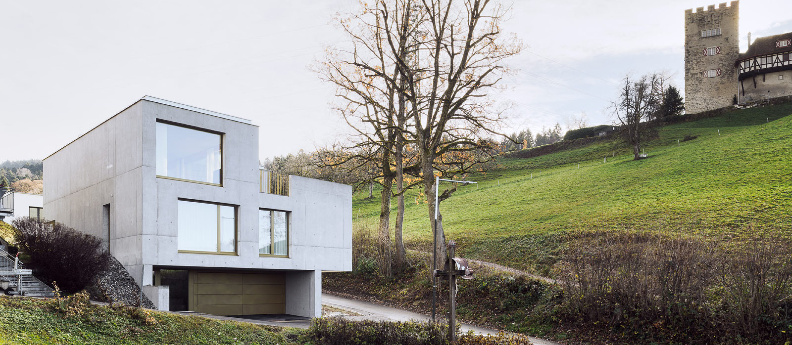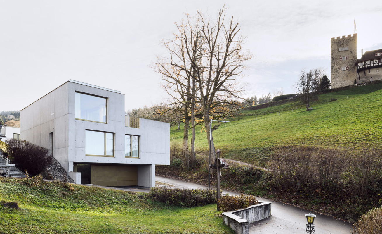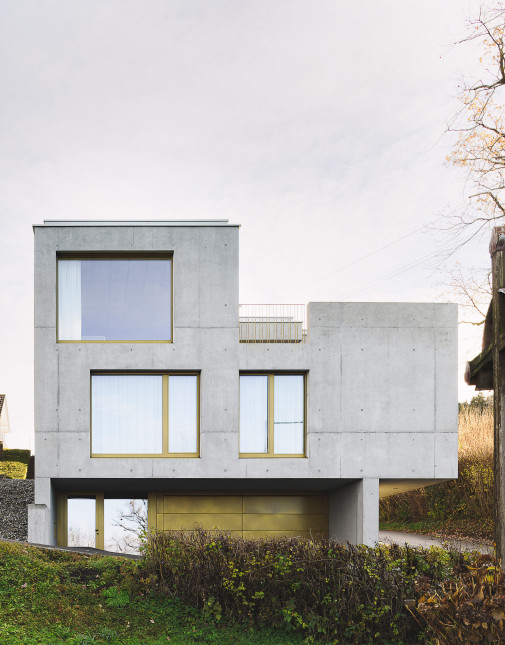 Das Haus G. befindet sich in einer leicht abfallenden Lage und bietet einen Blick über das Rheintal. Das dreistöckige Gebäude aus Sichtbeton ist sowohl innen als auch außen gut strukturiert.
