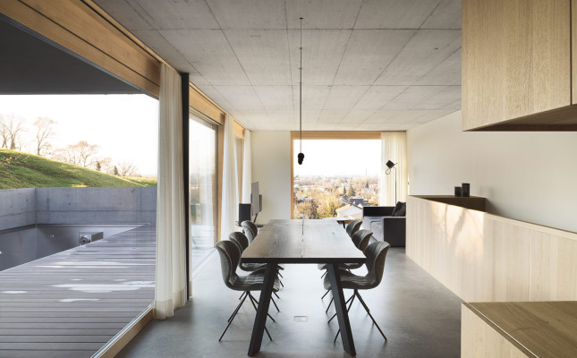 Ein besonderes Highlight ist der großzügige Außenbereich mit einem teilweise überdachten Pool. Durch die präzise Gestaltung der Betonwände entsteht trotz der exponierten Hanglage ein intimes Badeerlebnis im Freien.