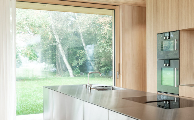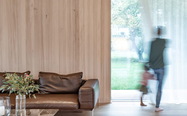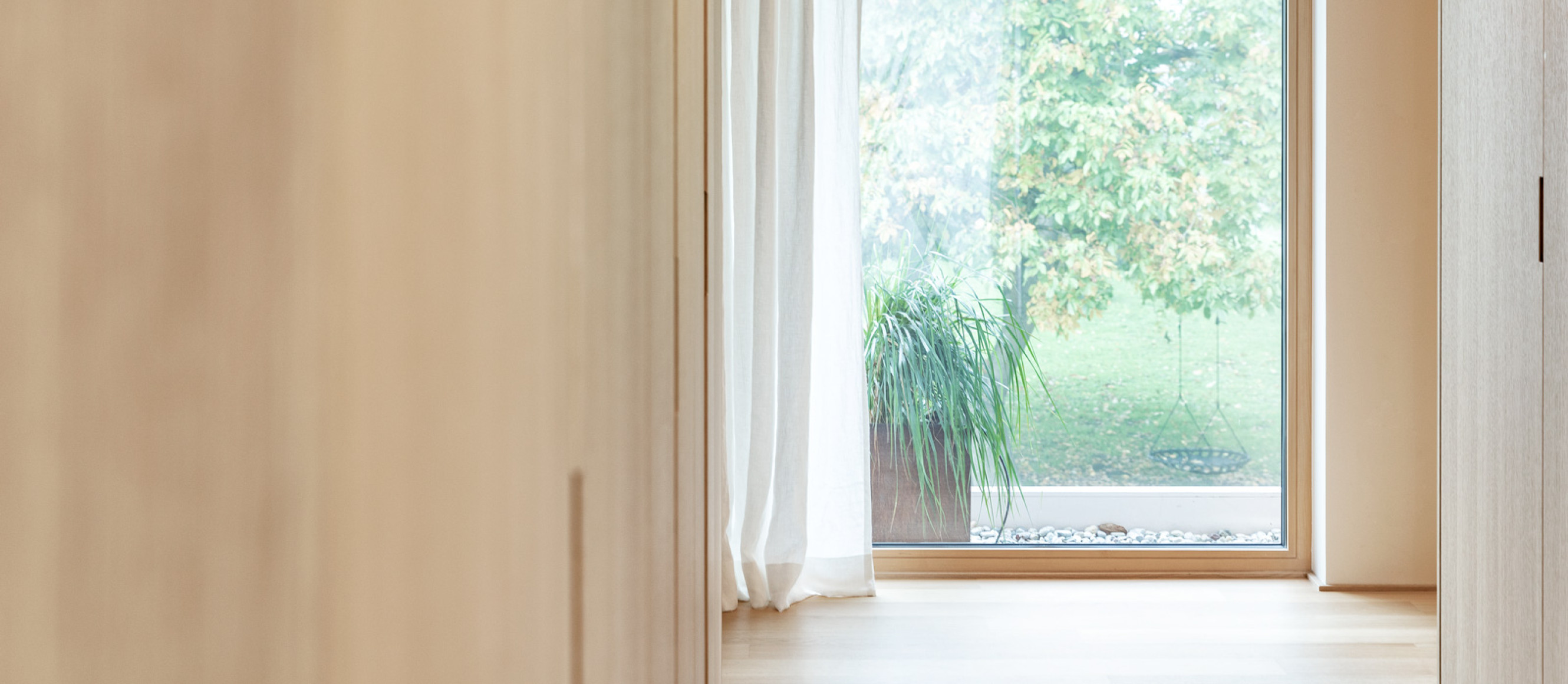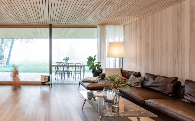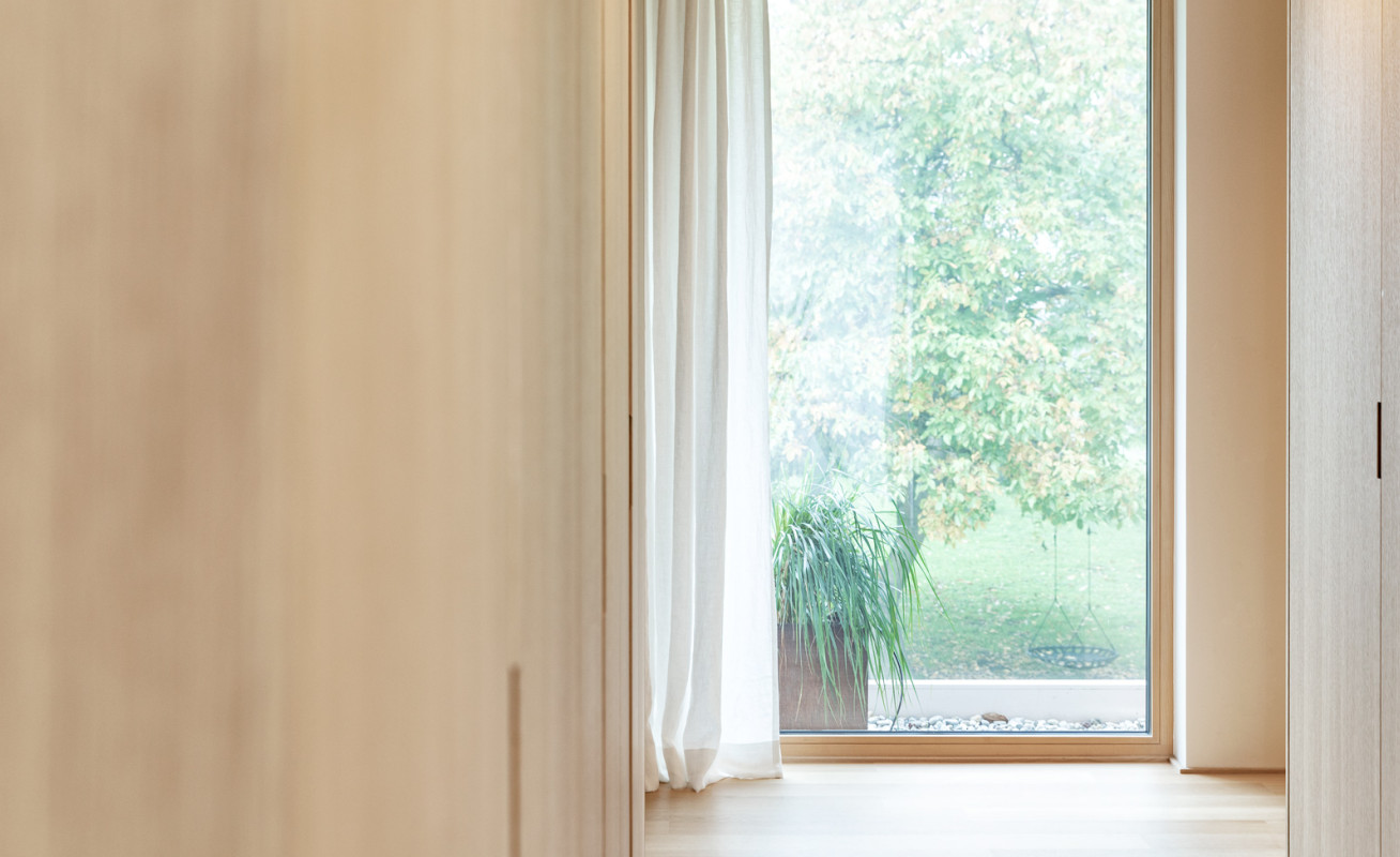 Die junge Familie hatte den Wunsch, dem Haus eine gemütliche Atmosphäre zu verleihen. Daher entschieden sie sich dafür, die Innenräume mit schlichtem Weißtannentäfer auszukleiden. Diese Wahl verleiht den Räumen eine weichere Ausstrahlung, reduziert die Härte und schafft ein Gefühl der Geborgenheit.