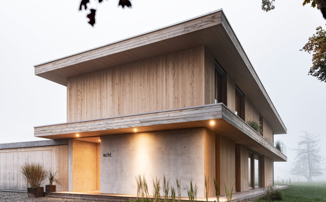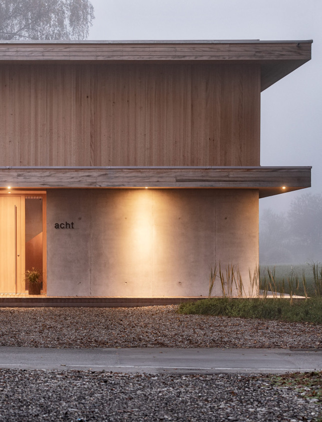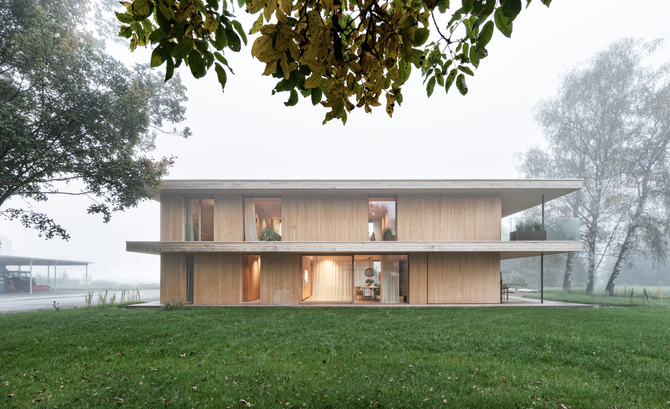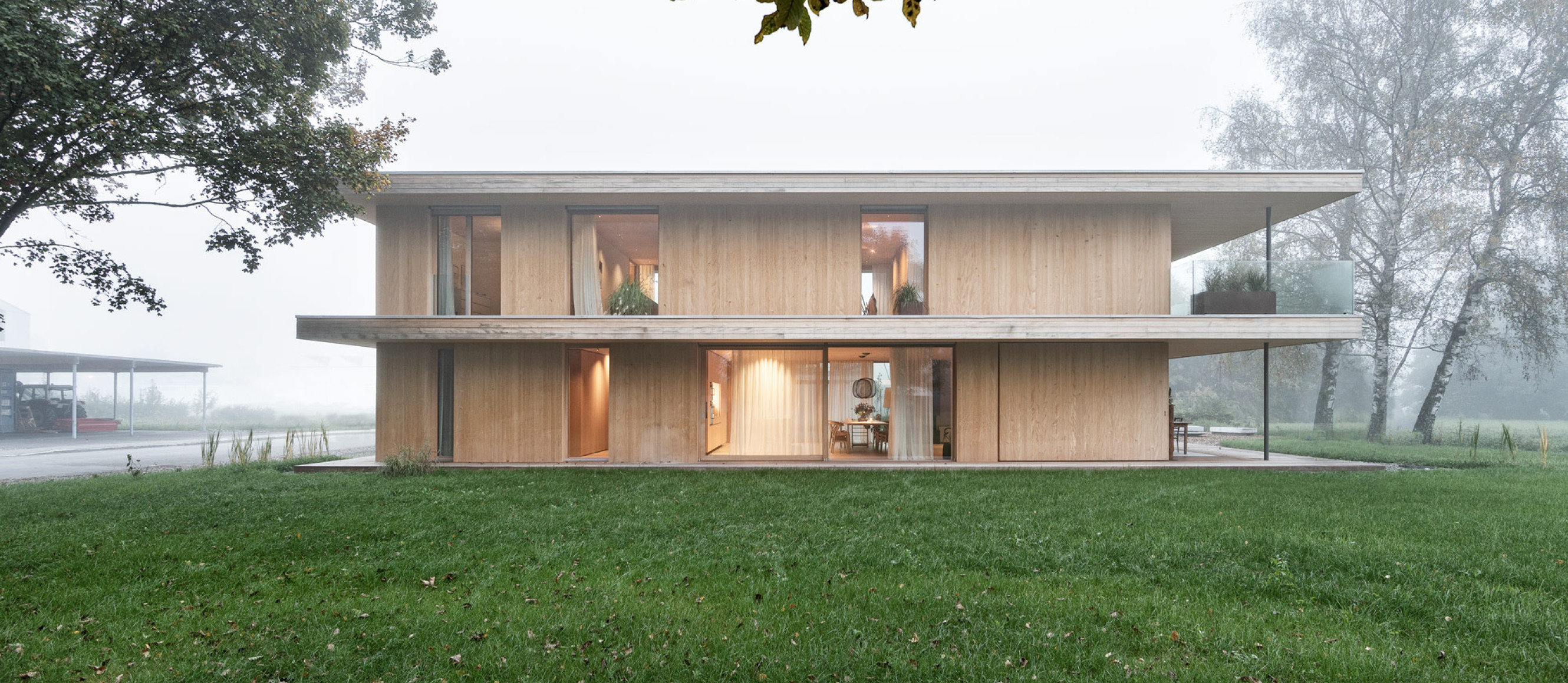 Das Haus J. befindet sich in einer ruhigen Lage am Rande von Lustenau. Es präsentiert sich als ein großzügiges Anwesen, dessen Baukörper kompakt gestaltet ist und teilweise mit einer vertikalen Tannenverschalung versehen wurde. Die auskragenden Decken ziehen sich quer hindurch und verleihen dem Gebäude eine interessante Dynamik.