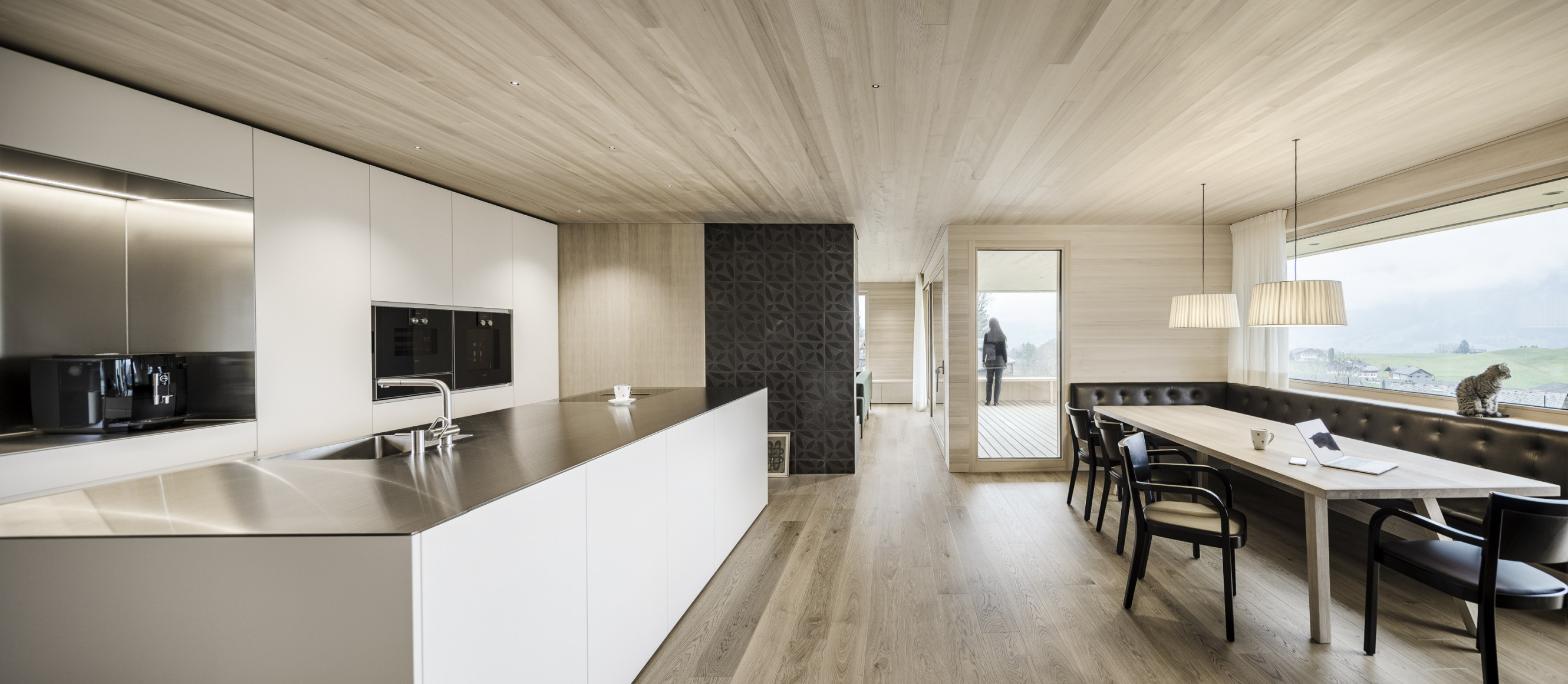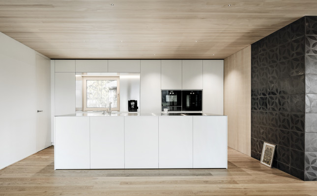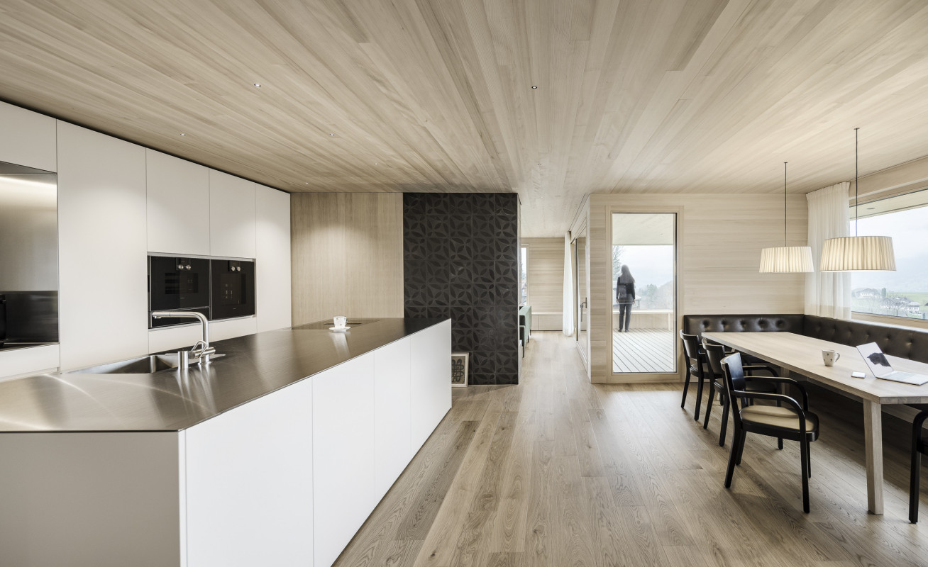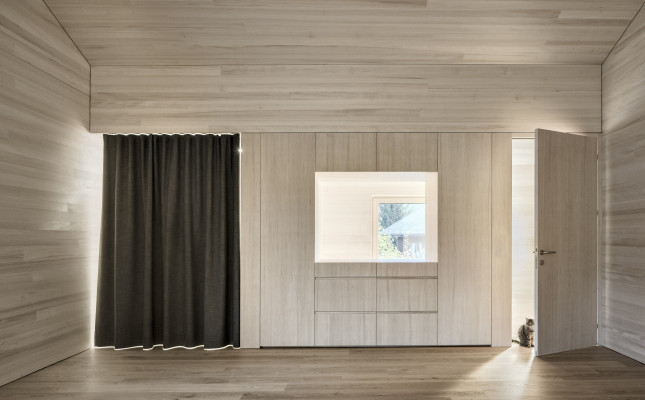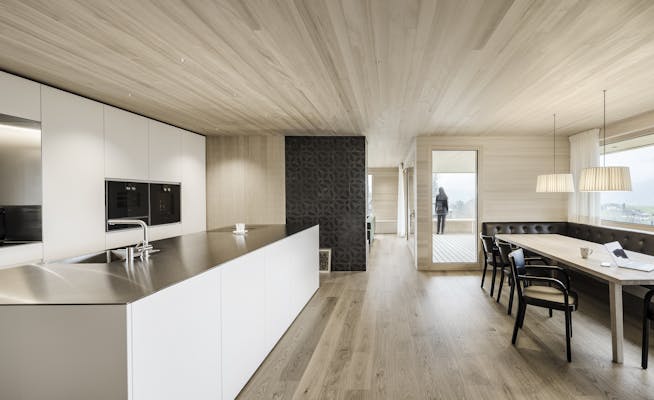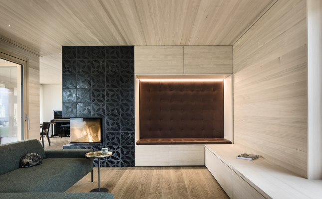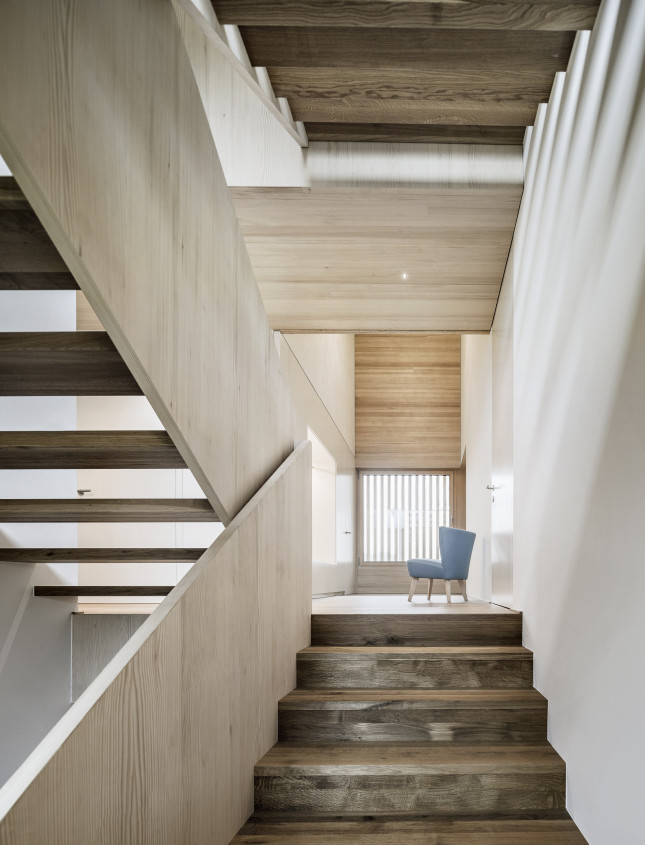 » Das Haus ist eine gelungene Mischung aus Traditionellem und Zeitgenössischem, eingebettet in seinen delikaten Kontext. Der architektonische Entwurf ist geradlinig in seinem einfachen Volumen und drückt dennoch einen Hauch von Verspieltheit und ein Gefühl für Komposition in der Fassade aus. Sowohl das Innere als auch das Äußere vermitteln ein großes Gefühl der Liebe zum Holz als Mittelpunkt des visuellen Interesses, wobei das gesamte Gebäude einen erdenden Respekt und eine Wertschätzung für seine Umgebung hat.«