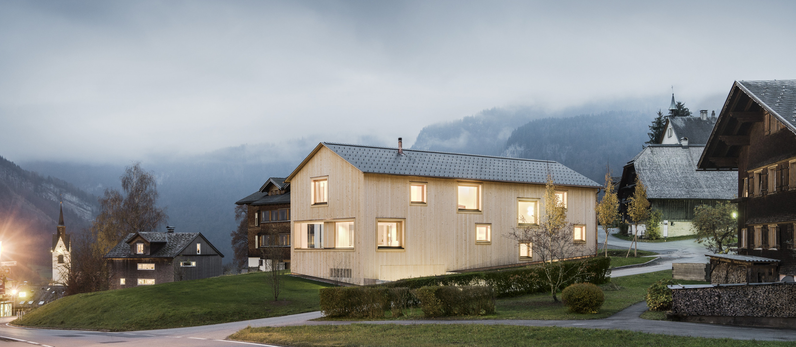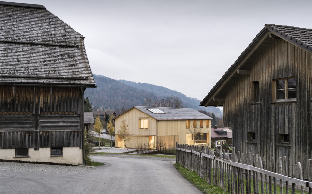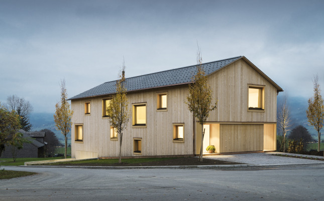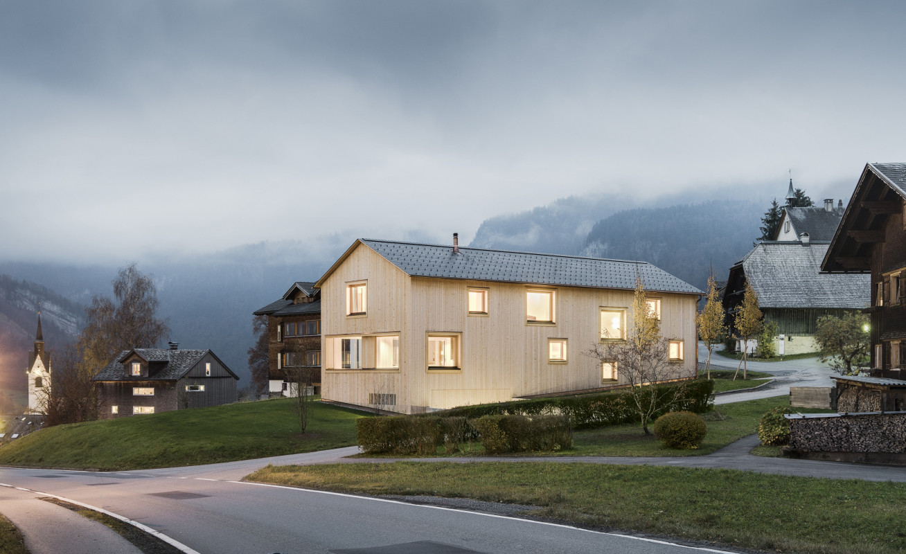 Das Gebäude steht in Schwarzenberg, einem kleinen Dorf im Bregenzerwald. Nachhaltiges Bauen, ein verantwortungsvoller Umgang mit der örtlichen Baukultur und der Bezug zur alpinen Kulturlandschaft waren die besonderen Anliegen der Bauherrenfamilie. Wie bei einem traditionellen Bregenzerwälderhaus ist auch hier das Gebäude in ein Vorderhaus mit Wohnteil und ein Hinterhaus mit Wirtschaftstrakt gegliedert. Im Hinterhaus wurden statt Stall und Heulager eine Arztpraxis und ein Therapieraum untergebracht.