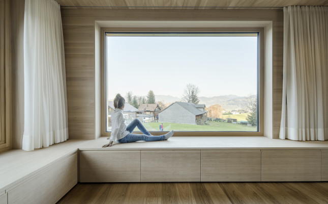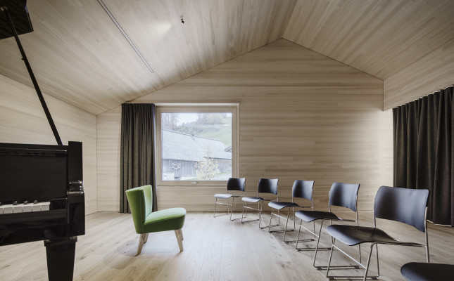 Die kubische Form und die funktionale Hülle reagieren auf die Bedingungen des Ortes und die Anforderungen der Bewohner. Das zweigeschossige Gebäude in Mischbauweise ist sanft in die Umgebung eingebettet. Sämtliche Baumaterialien wurden unbehandelt eingebaut. Außen ist das Gebäude mit einer naturbelassenen Fichtenfassade verkleidet, innen mit schlichtem Weißtannentäfer – so ist eine ausgezeichnete Ökobilanz garantiert. Herz des Hauses ist das Musik- und Bewegungszimmer mit Blick auf das dörfliche Heimatmuseum in unmittelbarer Nachbarschaft.