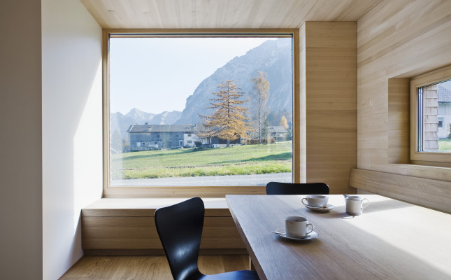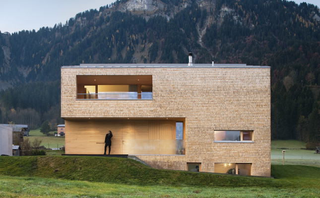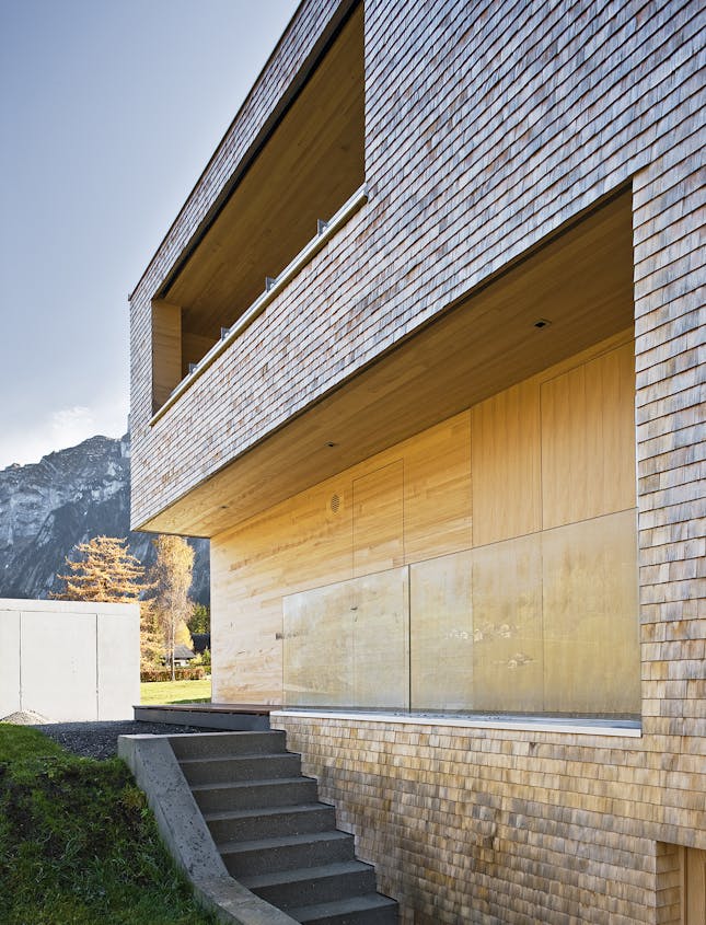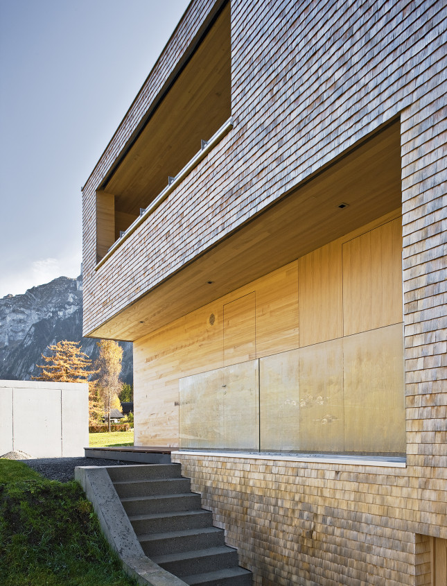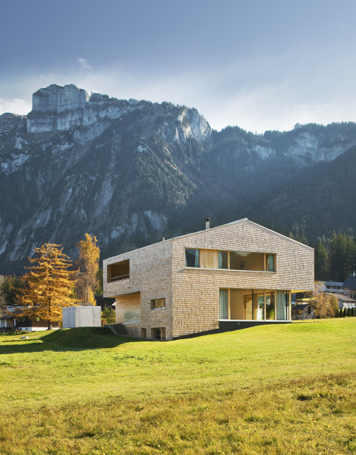 Um das Panorama mit Obstbäumen und Felsmassiven jeden Tag unmittelbar zu erleben, wünschte sich die junge Bauherrenfamilie ein naturverbundenes Einfamilienhaus, das sich in die Landschaft fügt, die Traditionen der Region aufgreift und gleichzeitig den Anforderungen des Familienalltags gerecht wird. Die Weißtannenschindeln, deren Holz im eigenen Wald des Bauherrn geschlagen wurde, legen sich wie Schuppen über die Fassaden.