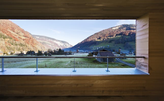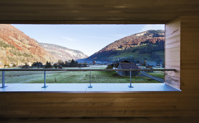 » Dieses naturverbundene, ultramoderne Holzschindelhaus mit Satteldach steht so in dieser Landschaft, als ob es schon immer da gewesen wäre. In den Glasscheiben spiegelt sich die Bergsilhouette des Kanisfluh-Massivs: Man ist hier ganz offensichtlich eins mit dem Universum. «