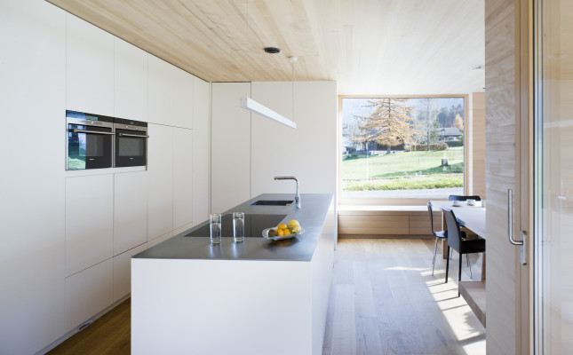 Küche und Wohnzimmer im Erdgeschoss sind als durchgängige Fläche zusammengefasst und werden durch die zentrale Treppe optisch voneinander getrennt. Im Obergeschoss befinden sich die Schlafzimmer und ein Gästezimmer, die sich ebenfalls durch den Bezug zur Natur auszeichnen. Zwei überdachte Loggien Richtung Norden und Süden öffnen den zentralen Flur samt den angrenzenden Rückzugsräumen nach draußen und machen die umliegende Bergwelt allseits präsent.