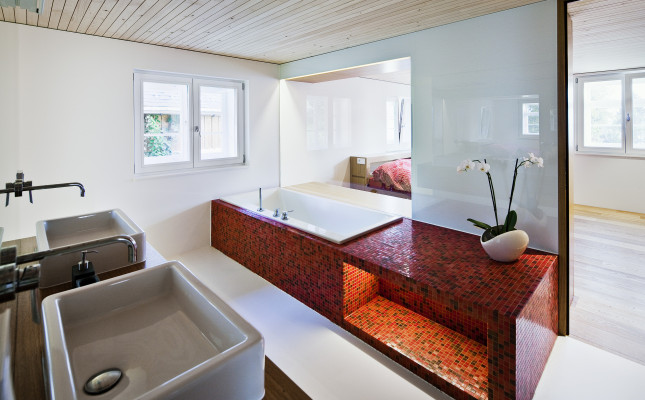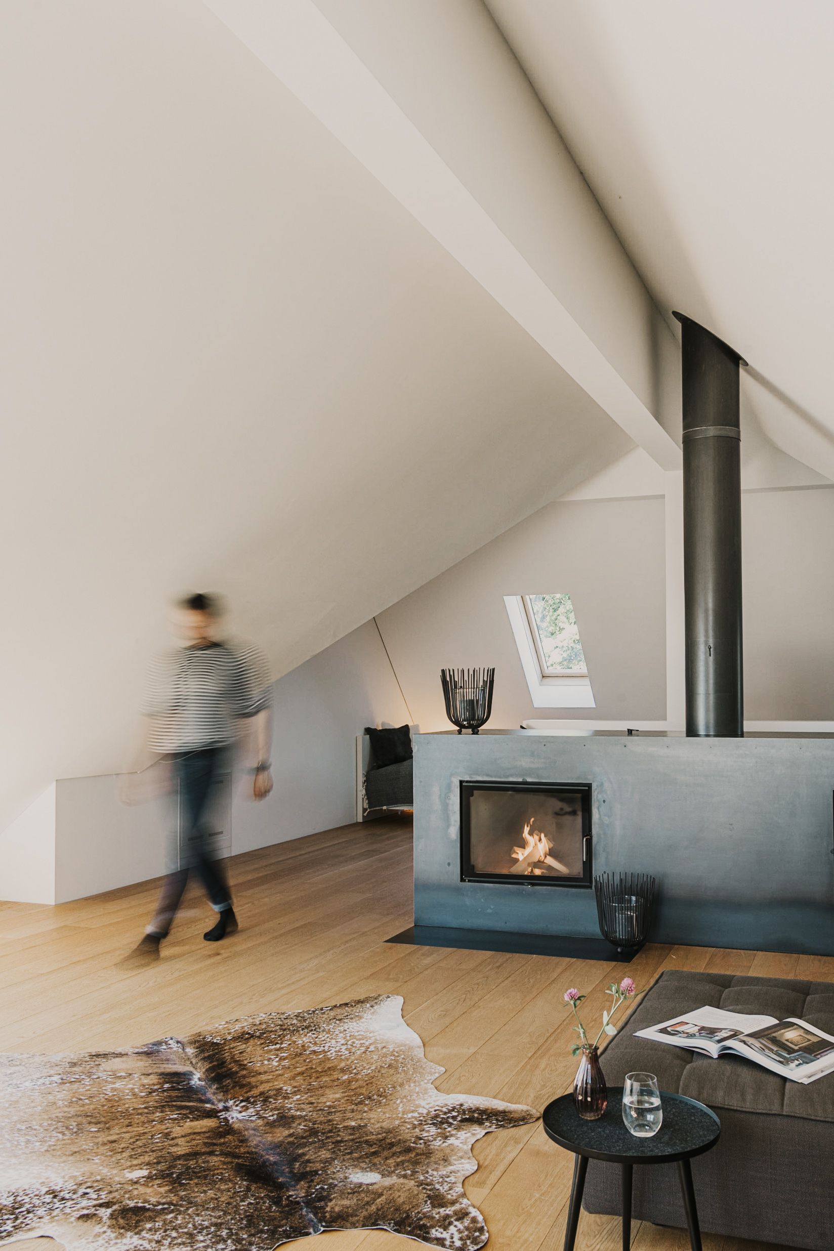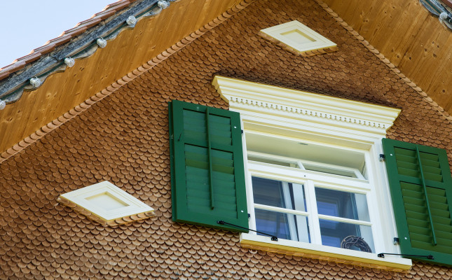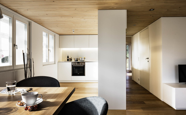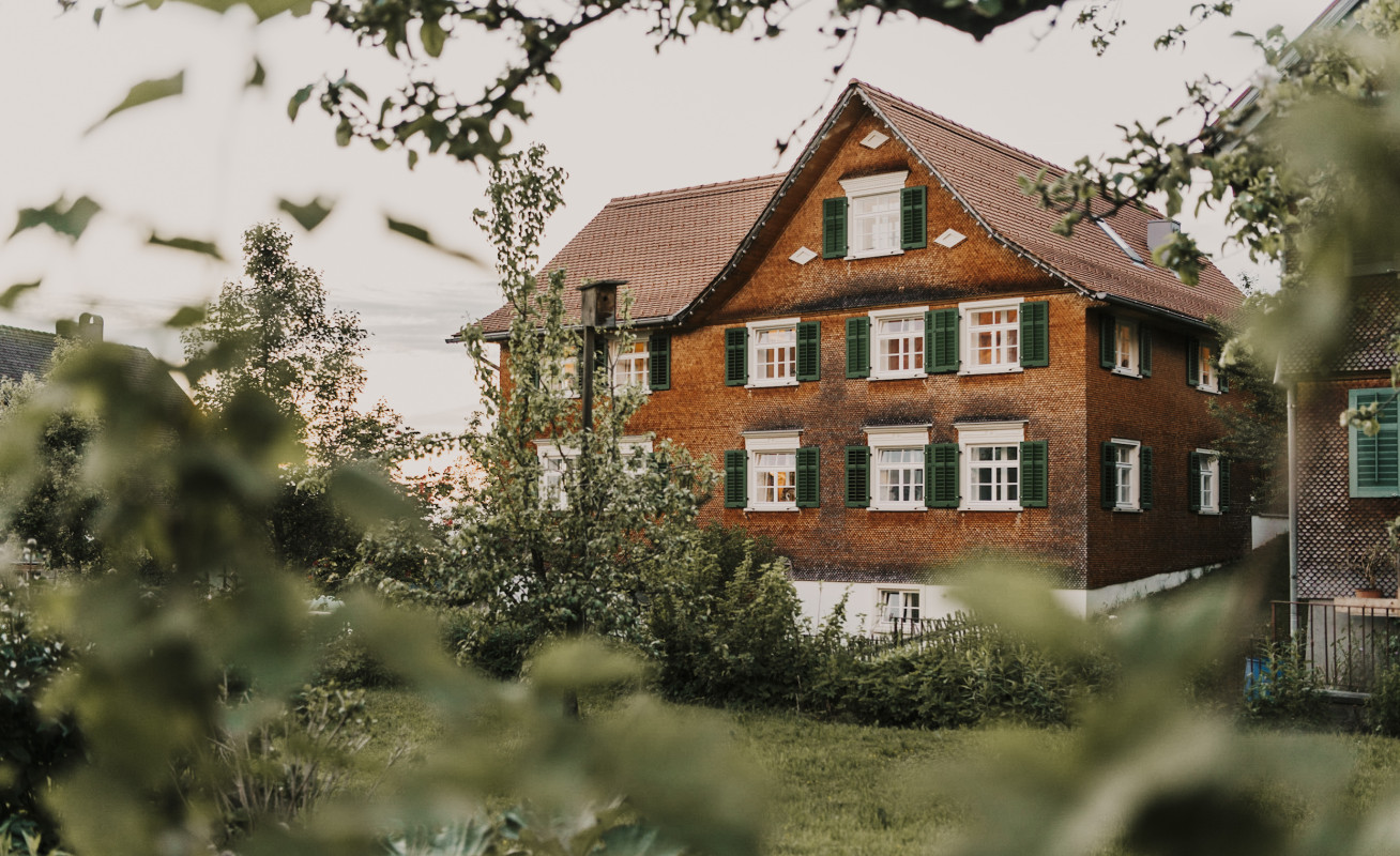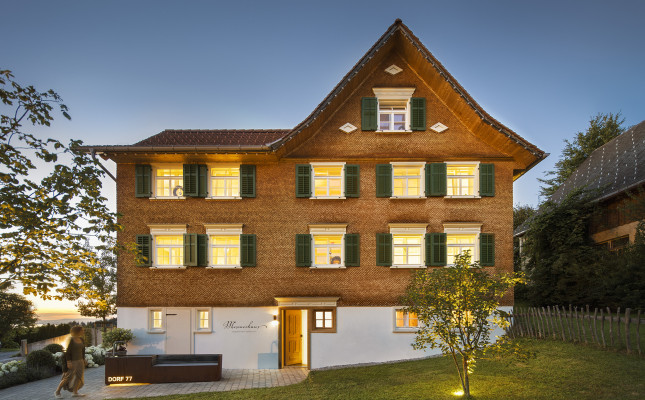 Das über 160 Jahre alte Mesmerhaus liegt inmitten des denkmalgeschützten Häuserensembles rund um die Basilika von Bildstein. Der Wallfahrtsort über dem Rheintal nahe Bregenz gilt als einer der schönsten Aussichtspunkte zum Bodensee hin. Bauherrin und Gastgeberin Evi Haller entwickelte das denkmalgeschützte Rheintalhaus gemeinsam mit Jürgen Haller und Architekt Christian Lenz zu einem besonderen Urlaubsort mit drei Ferienwohnungen. Erschlossen wird das ehrwürdige dreigeschossige Objekt mit annähernd quadratischem Grundriss unter dem penibel ausgeführten Biberschwanzziegeldach von dem zentral im Gebäude positionierten Treppenhaus. Im Eingangsgeschoss befinden sich außerdem die Garderobe, die Garage und diverse Nebenräume.