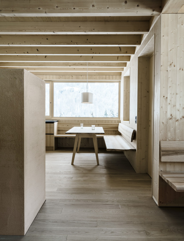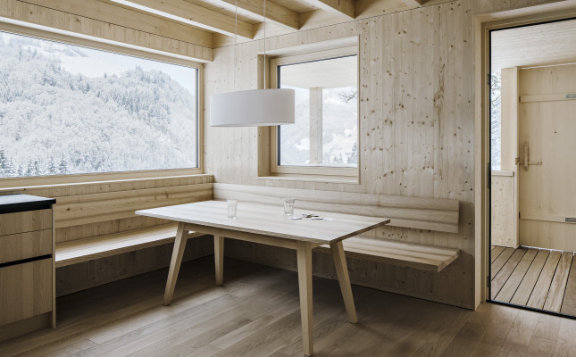 Der Hüttenzugang erfolgt über den traufseitigen Schopf – eine Art Veranda, in der man sich an sonnenreichen Tagen gerne aufhält. Beim Hineingehen öffnet sich der Koch- und Essbereich, von dem man seitlich die Stube betritt. Die Fenster sind so positioniert, dass sie die der Morgensonne zugewandten Räume erhellen. Über einen schmalen Gang führen die Türen zu den durch das Bad getrennten Schlafzimmern. Ein zentral positionierter Grundofen spendet an kälteren Vorsäßtagen die nötige Wärme. Er wird vom Gang aus beheizt. Im Dachgeschoss befindet sich das Heulager, das bei entsprechender Müdigkeit durchaus komfortabel sein kann.